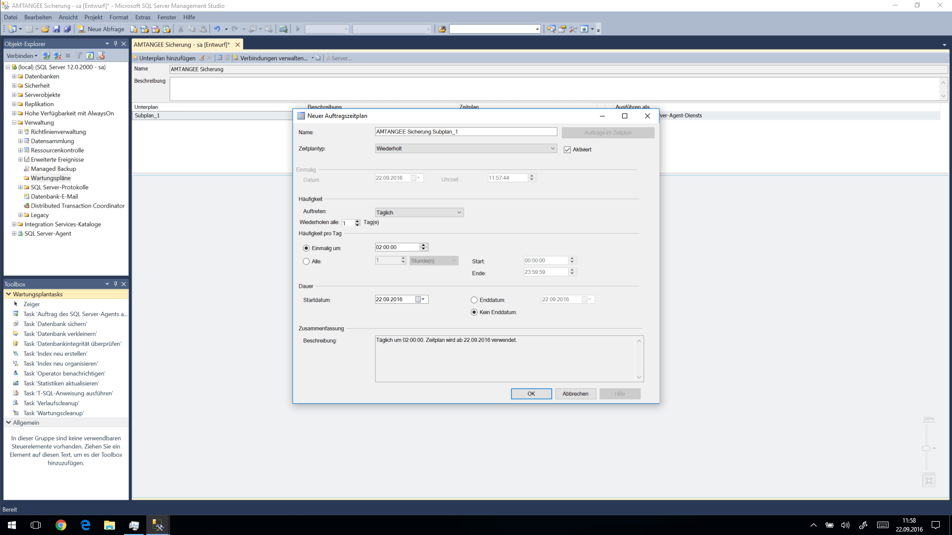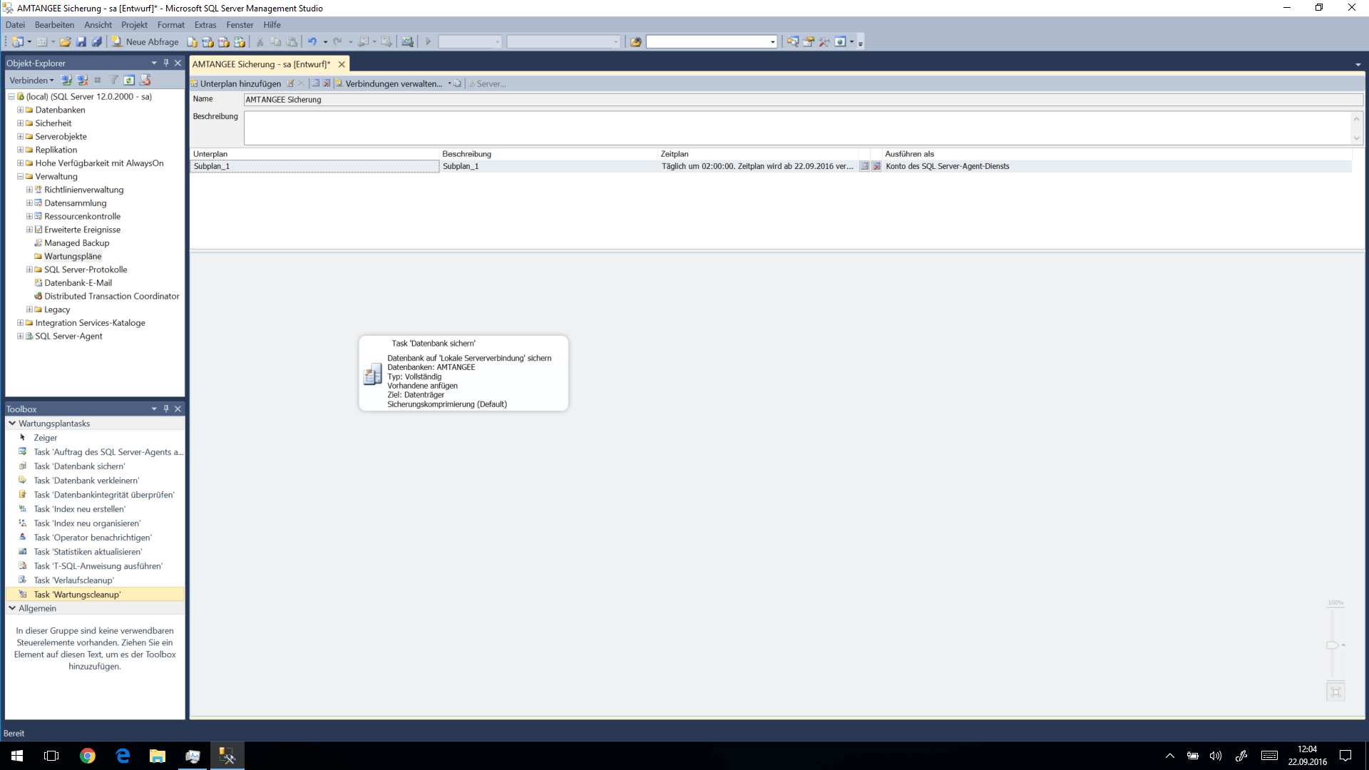 Durchatmen! Denn damit es gar nicht erst so weit kommt, zeigen wir Ihnen, wie Sie einen Backup-Plan für Ihre AMTANGEE Datenbank erstellen können, damit Ihre Daten sicher sind. Sie benötigen hierzu lediglich eine Vollversion des Microsoft SQL-Servers sowie das SQL Server Management Studio (SSMS). (Hinweis: Auch mit der Express-Edition des SQL-Servers ist eine Datensicherung möglich. Wir vernachlässigen diese Option im Rahmen des Beitrags, weil die Vorgehensweise komplexer und mit erhöhtem Aufwand verbunden ist.) Als integrierte Umgebung zur Konfiguration und Verwaltung des SQL-Servers spielt das SSMS eine zentrale Rolle bei der Erstellung eines Sicherungsplans – und zwar als universeller Werkzeugkasten zur Datenbankpflege, der sich mit einfachen grafischen Tools wie auch einer Reihe komplexer Skript-Editoren von ambitionierten Anfängern ebenso komfortabel bedienen lässt wie von ausgebufften Administratoren. Die folgende Schritt-für-Schritt-Anleitung zeigt Ihnen, wie sich über einen Backup-Plan eine automatische Sicherung der AMTANGEE Datenbank konfigurieren lässt: