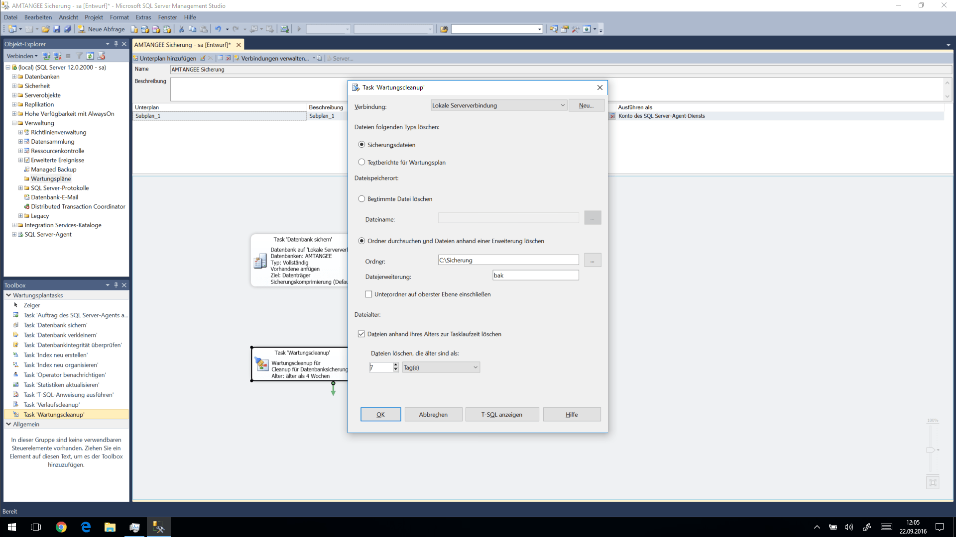Fertig? Noch nicht ganz! Denn wenn wir alte Sicherungsdateien nicht zeitgesteuert löschen, ist irgendwann unsere Festplatte voll. Wir benötigen daher noch einen weiteren Task "Wartungscleanup", den wir per Drag’n’Drop ebenfalls auf die Arbeitsfläche ziehen: