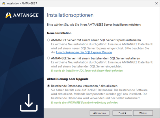 STOP – SIE BENÖTIGEN ADMIN-RECHTE! Für das Upgrade von AMTANGEE benötigen Sie einen User, der sowohl Windows-Administrator als auch AMTANGEE-Administrator ist. Stellen Sie dies vor der Installation sicher. Erfahren Sie hier mehr über Rechte in AMTANGEE.